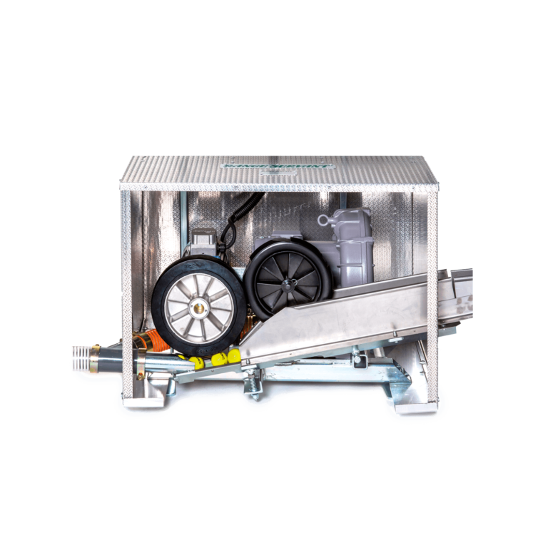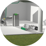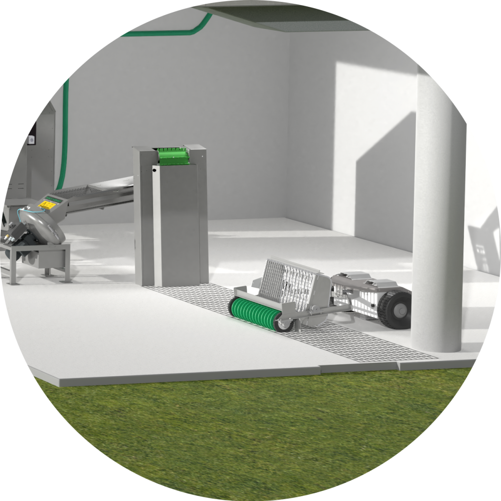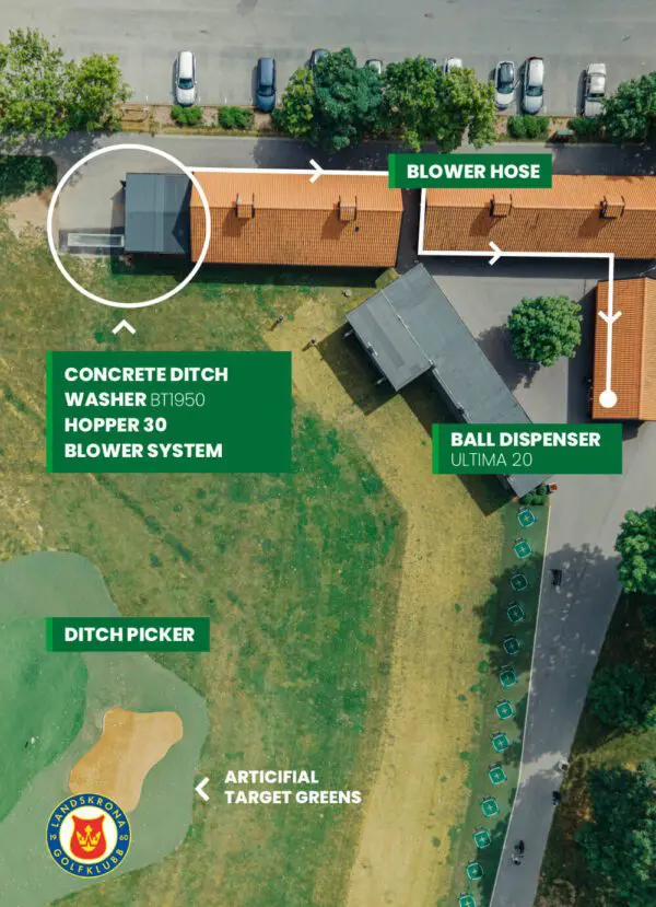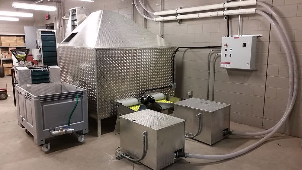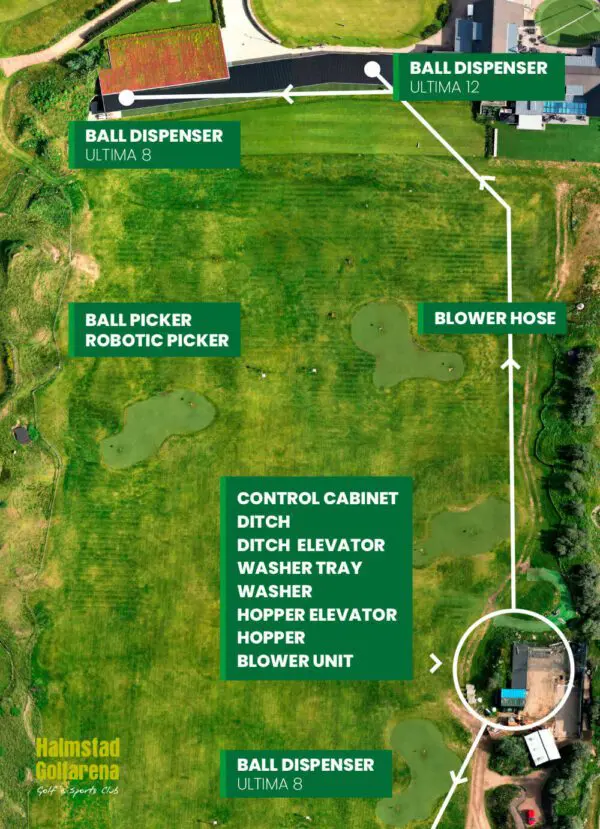 Syöttö suoraan pallonpesurista automaattiin. Pyörät siirtävät pallot kuljetusputkeen, josta pallot puhalletaan kompressorin suurella puhallusvoimalla palloautomaattiin.